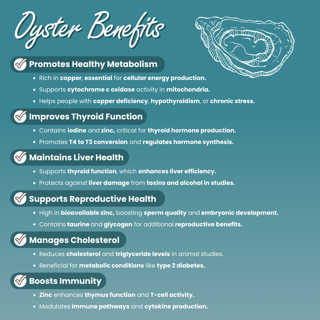 Rich in Nutrients: Oysters are known to be a significant source of bioavailable vitamins, minerals, and amino acids, including Zinc, Vitamin B12, Copper, and Selenium, Iodine, and Manganese.