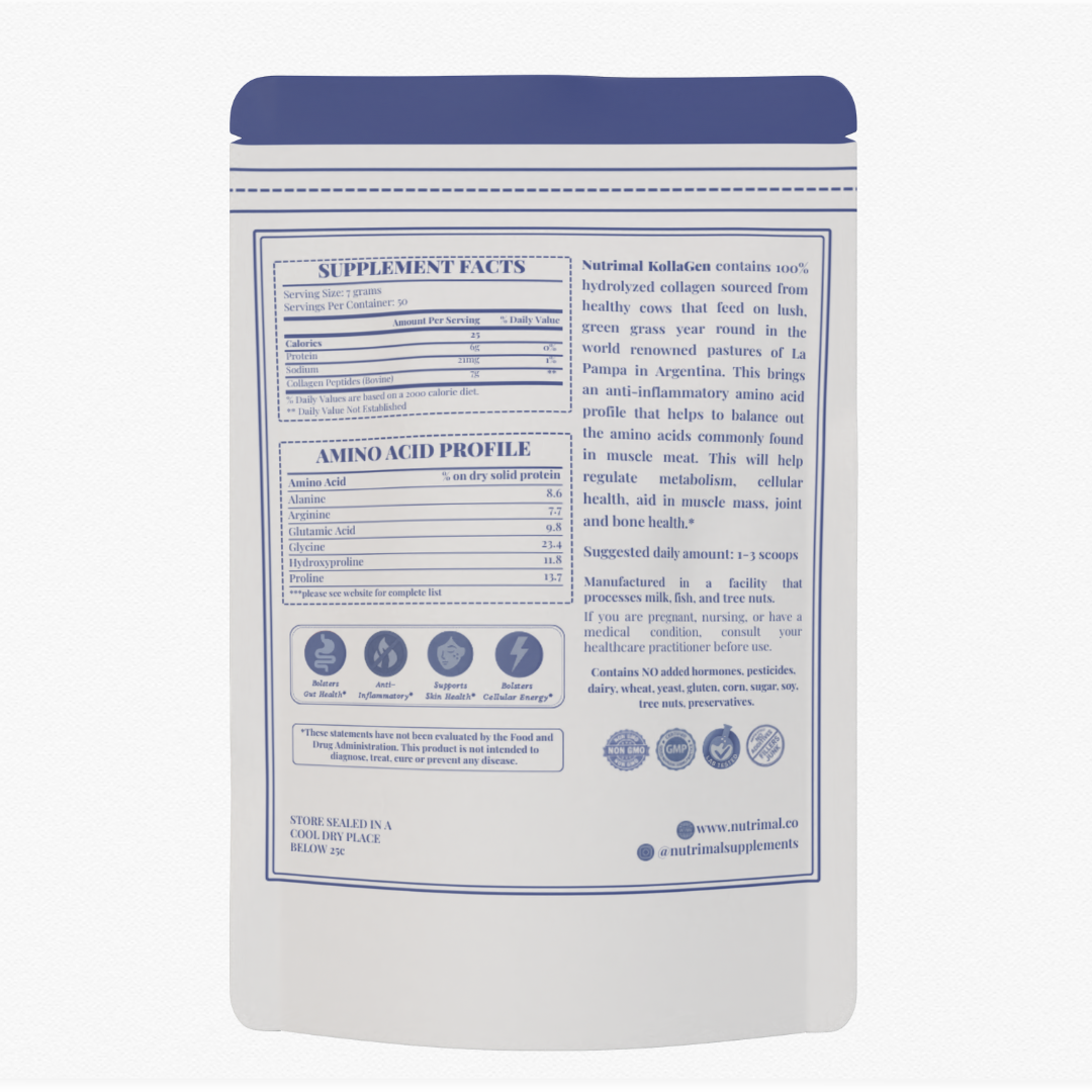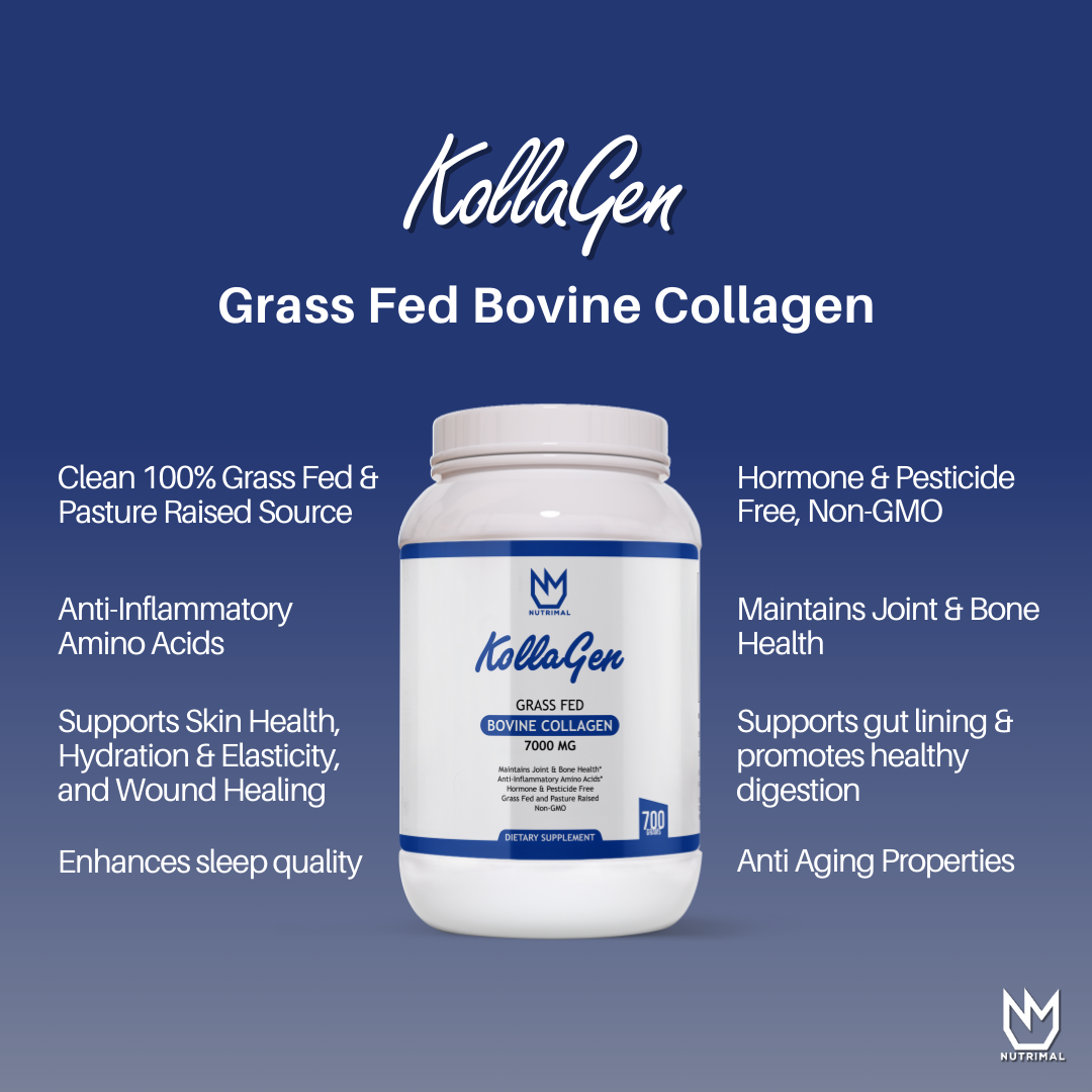 KollaGen, our Grass-Fed, Grass-Finished Collagen Powder is comprised of 100% hydrolyzed collagen from bovine hide with no fillers, additives, or artificial ingredients.